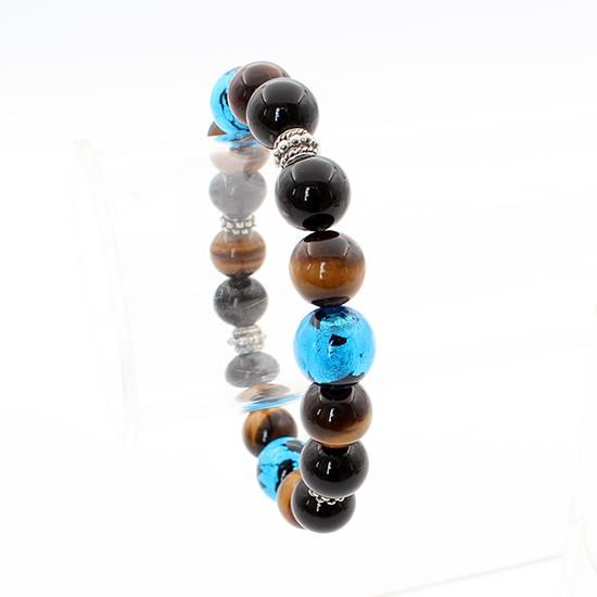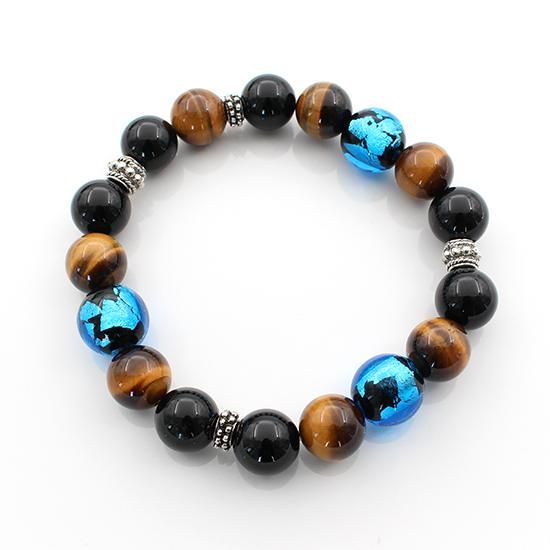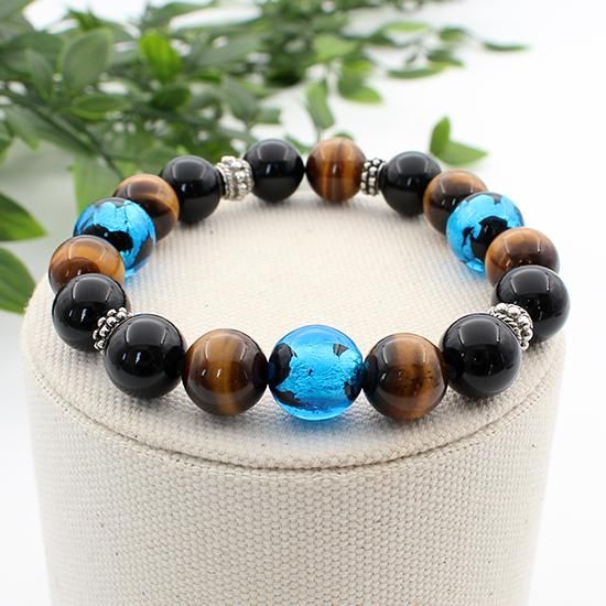 深海ブルー®とんぼ玉ブレスレット 14mm オニキス タイガーアイ ゴムブレス メンズ【AAL2205SB15B】
